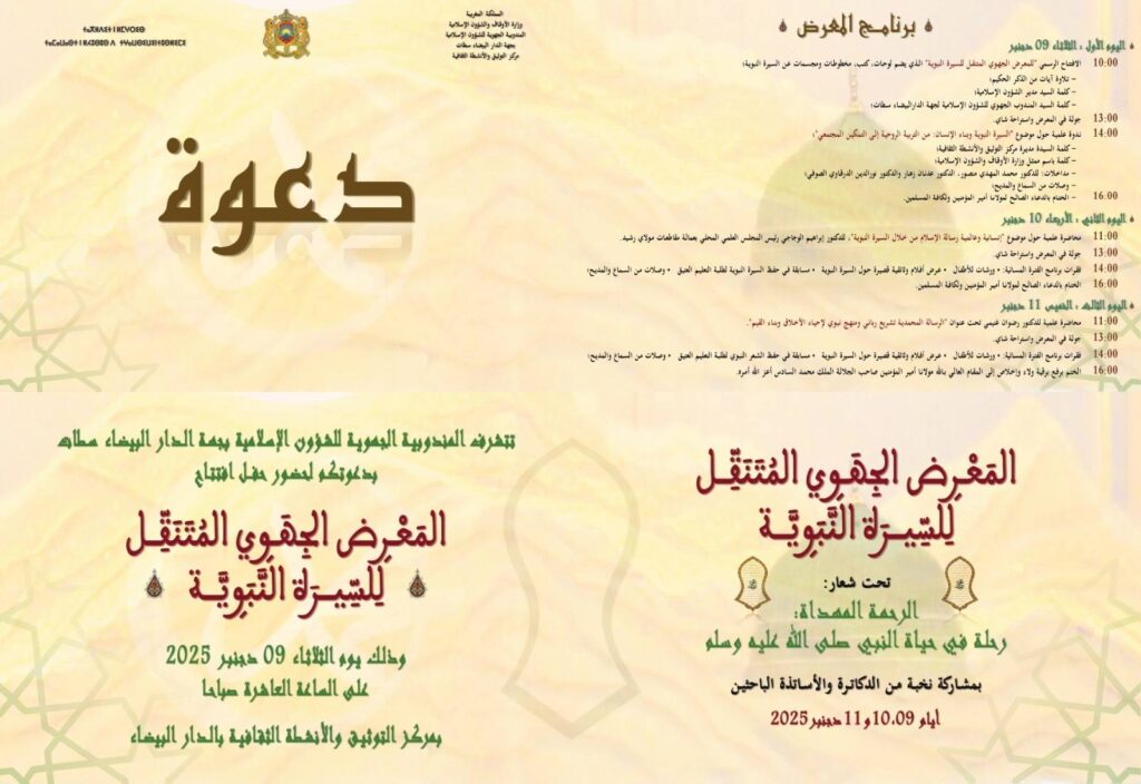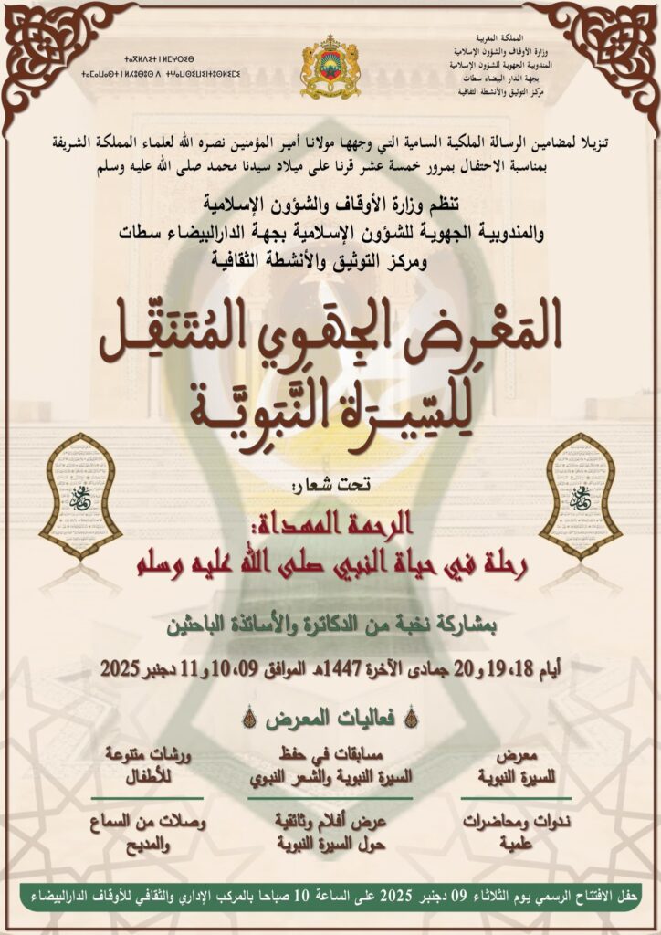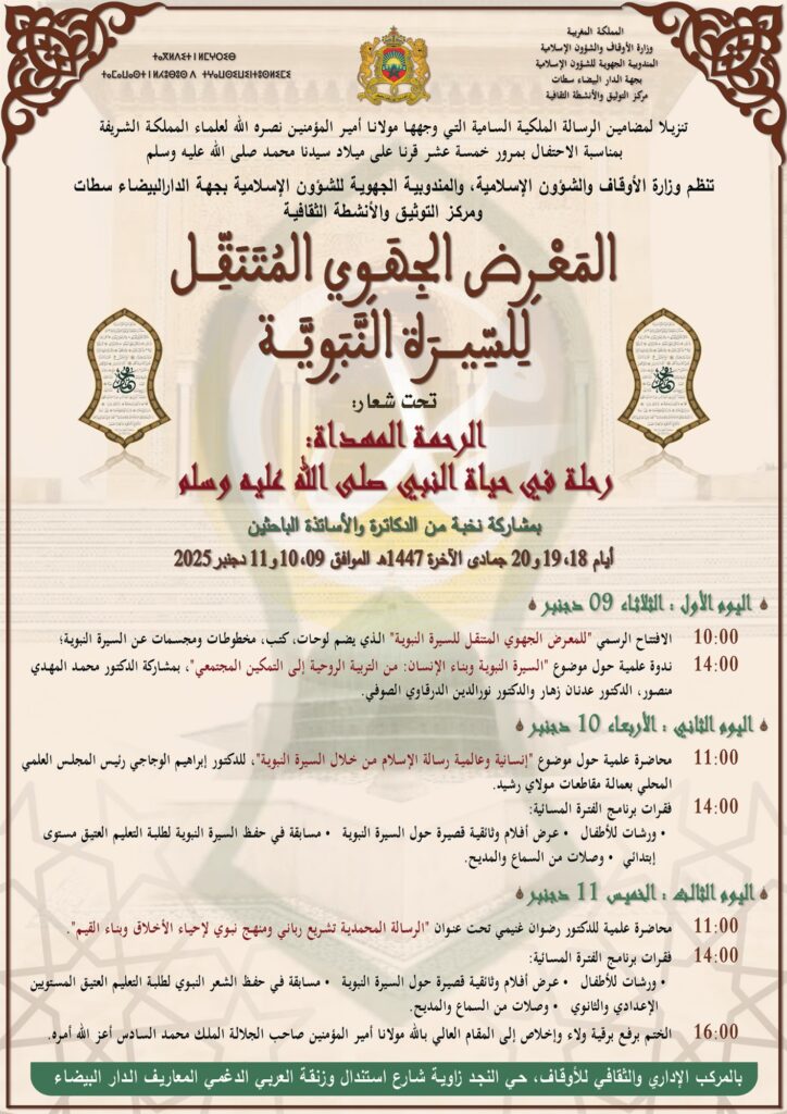 تنظم وزارة الأوقاف والشؤون الإسلامية، ممثلة في المندوبية الجهوية للشؤون الإسلامية بجهة الدار البيضاء سطات ومركز التوثيق والأنشطة الثقافية، تظاهرة علمية وثقافية متميزة تحت عنوان “المعرض الجهوي المتنقل للسيرة النبوية”. يأتي هذا الحدث الكبير تنزيلا لمضامين الرسالة الملكية السامية التي وجهها أمير المؤمنين صاحب الجلالة الملك محمد السادس نصره الله للعلماء، بمناسبة الاحتفال بمرور خمسة عشر قرناً على ميلاد النبي الكريم. ومن المقرر أن يحتضن المركب الإداري والثقافي للأوقاف بحي المعاريف في الدار البيضاء فعاليات هذا النشاط على مدى ثلاثة أيام متتالية، بدءاً من يوم الثلاثاء 09 دجنبر إلى غاية الخميس 11 دجنبر 2025، حيث يهدف المنظمون إلى تجسيد معاني المحبة والاتباع لصاحب السيرة العطرة من خلال برنامج متكامل يجمع بين العمق الأكاديمي والبعد الروحي. فلسفة المعرض ومحتوياته