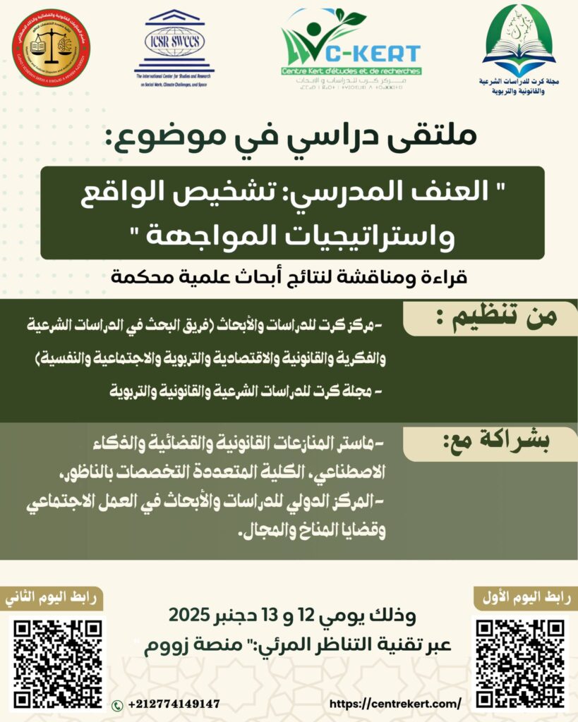 يعلن مركز كرت للدراسات والأبحاث (فريق البحث في الدراسات الشرعية والفكرية والقانونية والاقتصادية والتربوية والاجتماعية والنفسية) ومجلة كرت للدراسات الشرعية والقانونية والتربوية عن تنظيم ملتقى دراسي دولي مهم تحت عنوان: “العنف المدرسي: تشخيص الواقع واستراتيجيات المواجهة”.