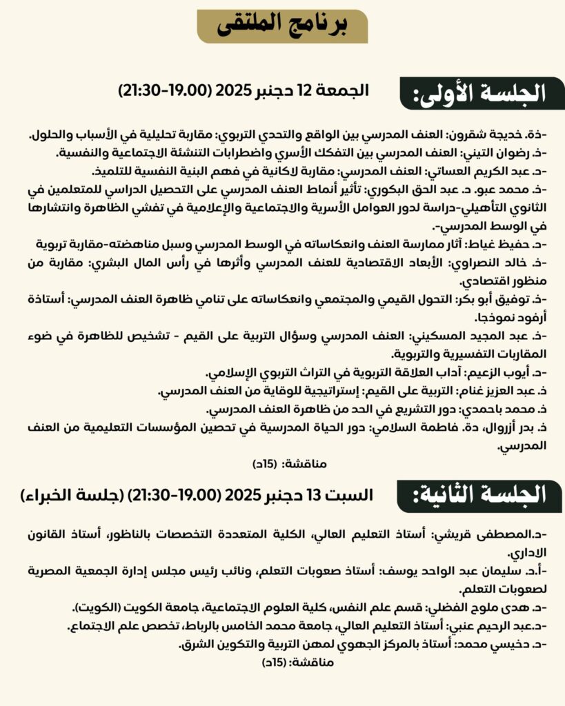 - تتضمن مداخلات حول تشخيص العنف المدرسي بين الواقع والتحدي التربوي، وتأثيره على التحصيل الدراسي، ودور الإعلام في تفشي الظاهرة.