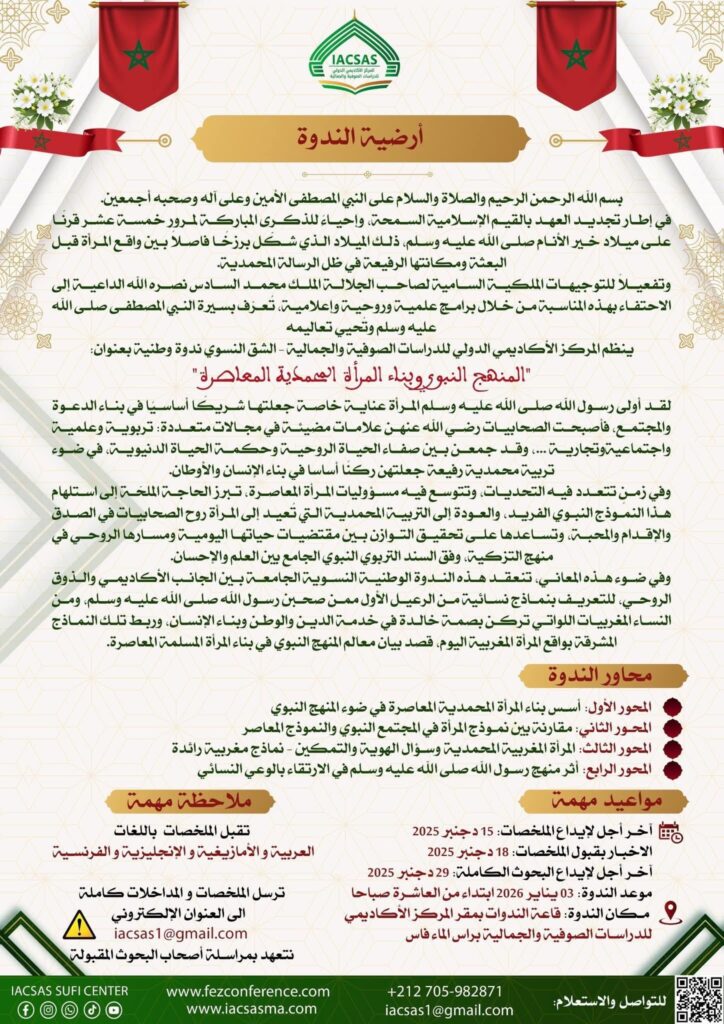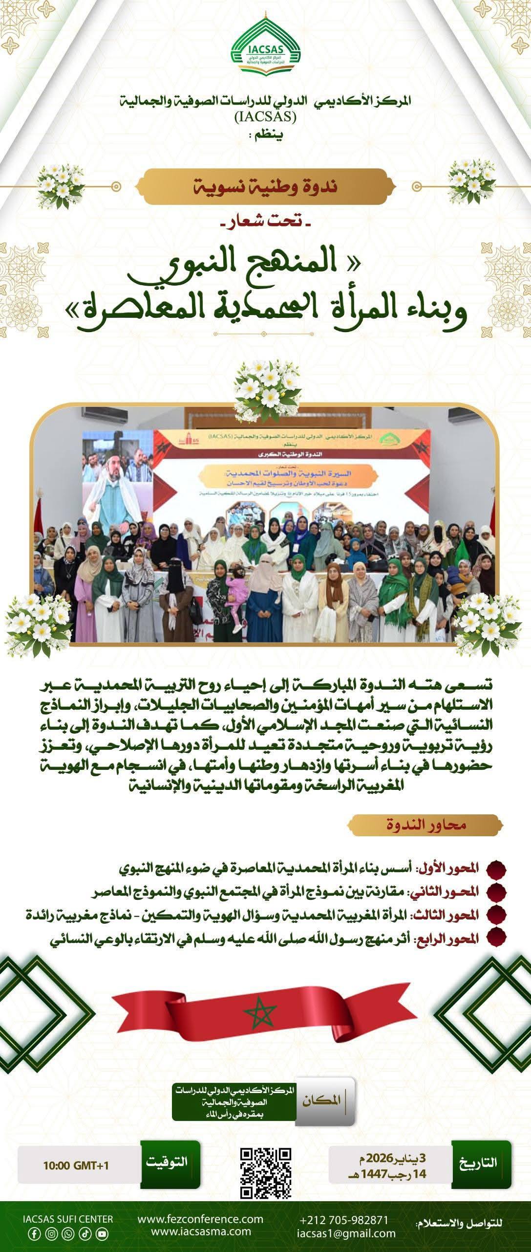 ينظم المركز الأكاديمي الدولي للدراسات الصوفية والجمالية (IACSAS) بالتعاون مع جهات أخرى، ندوة وطنية هامة تحت شعار: “المنهج النبوي وبناء المرأة المحمدية المعاصرة”. تأتي هذه الندوة في سياق تجديد العهد بالقيم الصوفية والإسلامية السامية، واحتفاء بذكرى المولد النبوي الشريف. وتهدف الندوة إلى الإسهام في إحياء روح التربية المحمدية الأصيلة، وبناء رؤية تربوية وروحية متجددة تعيد للمرأة دورها الإصلاحي في المجتمع.